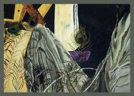 Pfauenfedern mit Stoff - 1999 - Acryl, kaschiert - 100x70cm - €950
